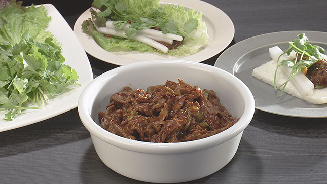 サンドイッチ用食パン、またはサニーレタスに牛肉の甜麺醤炒め、大根、香菜をのせて包んで食べる。