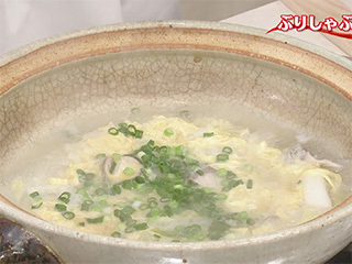 具材を食べた残りの汁に、ごはん160gを入れて煮る。ごはんがほぐれたら卵1個を溶いて流し入れ、土佐酢適量を加えて味をととのえ、万能ねぎの小口切り2本分を散らす。