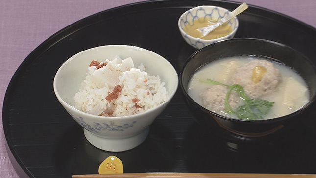 ゆるめに溶いた辛子を使用。吸い口は、汁ものに香りや風味を添えることで、生臭みを消したり、食欲をそそる作用がある。柚子や木の芽など、季節感のあるものを添えることも。