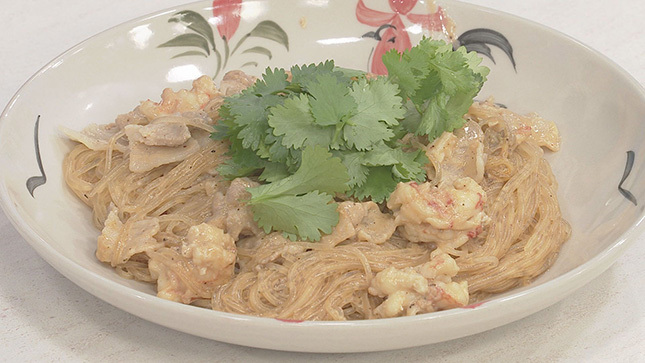 春雨は、緑豆のでんぷんを原料として作られるものと、じゃが芋やさつま芋のでんぷんから作られるものがある。ここではコシと弾力がある緑豆春雨を使用。