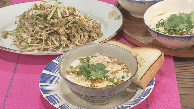 乾燥の桜えびは、うまみ成分が多く、香ばしさがある。今回は干しえびの代わりに使用。ザーサイは、味つきのものを使用。塩漬けの場合は、塩を抜いてから用いる。