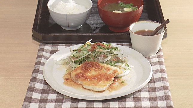 香味野菜をたっぷり添えて、かじきのソテーと同じ「梅だれ」で召し上がれ!