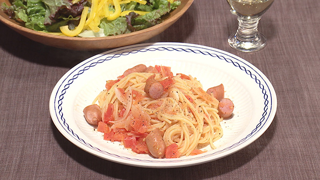 先に材料を切っておき、スパゲティをゆで始めてすぐにソースを作り始めると、ちょうどよく仕上がります