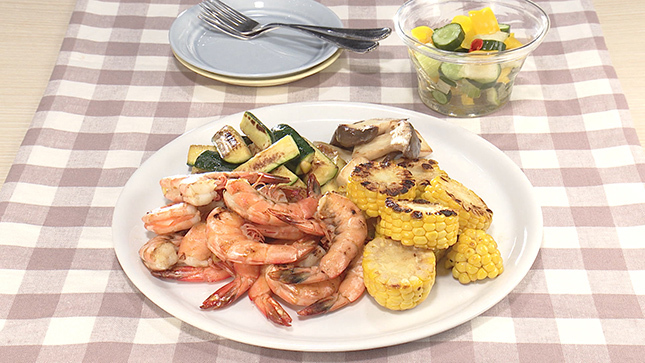 えび、とうもろこし、ズッキーニのマリネ焼き