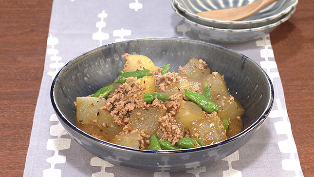 淡白な冬瓜に豚ひき肉がからみ、ごはんがすすむおかずです!