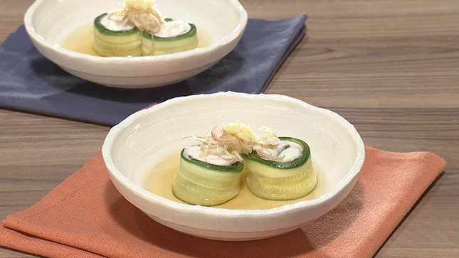 ズッキーニでかますを巻くときは、盛り付ける上側をそろえて巻くときれいに見えます