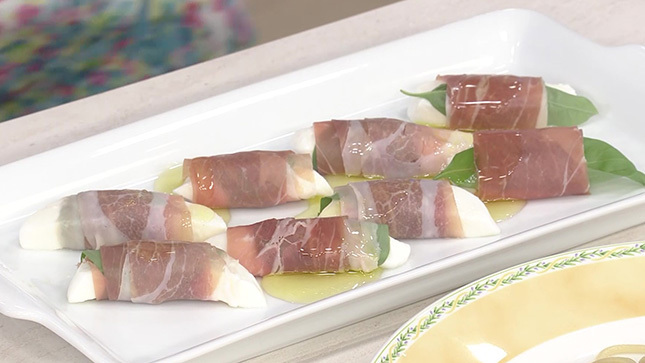 モッツァレラチーズには塩味がないので、生ハムの塩味とうまみがよく合います。スパゲティと一緒に召し上がれ!