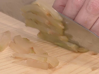 うまみのあるザーサイを味だしに使います。水で洗うときは、表面の塩分だけをサッと落としましょう