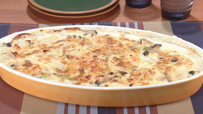 しめじや長ねぎも加えて具だくさんのグラタンです。熱々を召し上がれ!