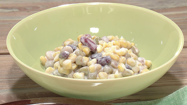 「コーンとビーンズのヨーグルトサラダ」は混ぜるだけで完成する手軽なサラダです。ぜひピラフに添えてください!