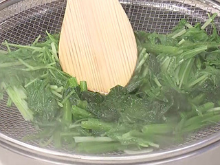 蒸し煮にしたほうれん草と水菜にも香味じょうゆをかけて召し上がれ!