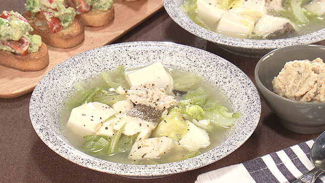 さっぱりとしたスープにくるみのソースを添えて、溶かして「味変」しながら召し上がってください