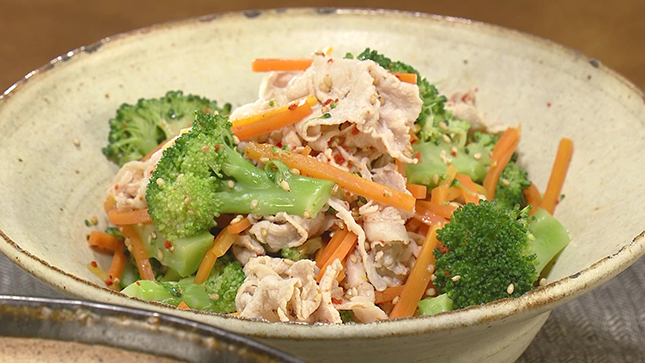 豚肉をゆでた後にアクを除いたお湯で野菜をゆでることで、豚肉のうまみが野菜にプラスされます