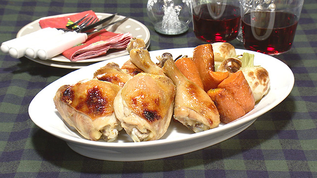 鶏肉のうまみを吸うように、かぶとにんじんは肉と肉の間に並べるようにしましょう