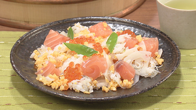 イクラ、炒り卵、ゆでた絹さや、塩で締めたサーモン。