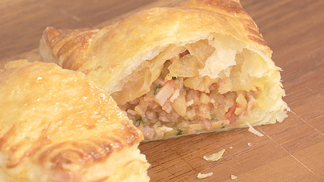 具材に汁気があるとパイ生地がサックリ焼き上がらないので、汁気がなくなるまでしっかり炒めましょう
