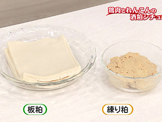 日本酒を造る工程でもろみを圧縮したあとに残る固形物。絞ったそのままの板粕、やわらかいペースト状に練った練り粕があり、今回は練り粕を使用。アルコール分を8%前後含み、煮立ててもアルコール分が残るので、子どもが食べる場合は、酒粕の量を控えるようにする。