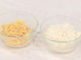 チェダーチーズは、牛乳から作られるセミハードタイプのチーズで、淡い黄色からオレンジ色をしている。パルメザンチーズは、イタリアを代表するハードタイプのチーズ。今回はおろしたてのパルミジャーノ レッジャーノを使っている。