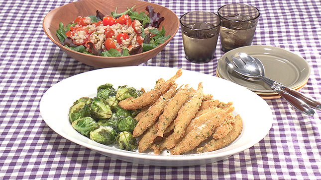 芽キャベツは油がはねやすいので、鍋のふたや油はね除けの道具を使いながら素揚げにしてください