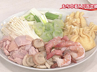 もち巾着、蒸し帆立、えのき茸、長ねぎ、ゆでた白菜、鶏肉、えび。