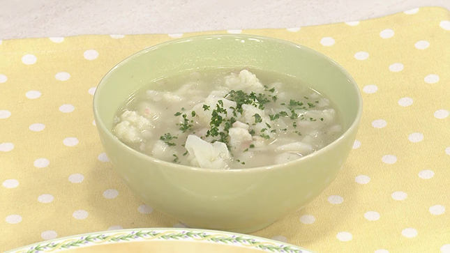 スープのカリフラワーとベーコンも煮る前に炒めることで、うまみを引き出しましょう