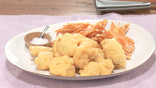卵白と小麦粉を合わせた軽い衣が、にんじんの甘みとよく合います。盛り合わせて召し上がれ!