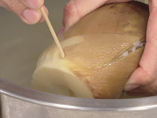 <材料> 新たけのこ 2~3本(800g~1.2㎏) 米 大さじ3 赤唐辛子 1本 <ゆで方> 1:たけのこは穂先を斜めに切り落とし、1㎝深さほどの切り込みを縦に1本入れる。 2:鍋にたけのこを入れ、たけのこがかぶるくらいの水(約3ℓ)、米、赤唐辛子を加えて強火にかける。沸騰したら弱火にし、落としぶたをして、1時間30分ほどゆでる。アクはこまめに除き、たけのこに常に湯がかぶるように、途中で水を足しながらゆでる。 3:たけのこの根元に竹串がスッと通ればゆで上がり。そのままゆで汁の中に半日ほどおく。穂先の姫皮を残して皮をむき、縦半分に切ってよく水洗いする。 ●保存する場合は、保存容器に入れ、かぶるくらいの水を加えて冷蔵で保存。毎日水をとりかえ、3~4日保存可能。