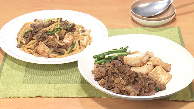 材料・作り方(1人分) 中華風肉豆腐の半量を使用。 1:ゆでうどん1玉(200g)を表示通りに電子レンジで温め、フライパンに入れる。しょうゆ大さじ1、砂糖小さじ1、水1/2カップを加えて中火にかけ、ほぐす。 2:煮立ったら中華風肉豆腐を加え、豆腐を一口大にくずし、汁気がなくなるまで炒める。