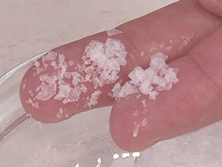 大きく結晶化した塩で、フレーク状のものなどもある。料理の仕上げにふることで、味のムラと食感を楽しむことができる。