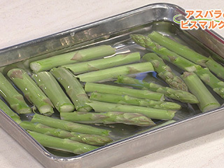 アスパラガスは、料理にとりかかる前に冷たい水に30分ほどつけておく。野菜に水分をもどすことで、みずみずしく仕上がる。