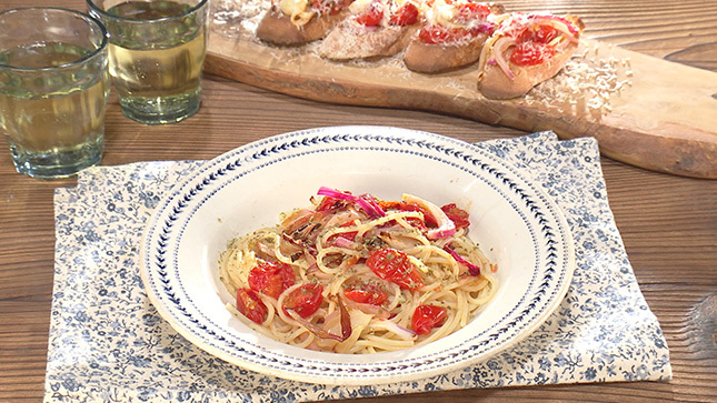 好みのパンを7~8㎜厚さに切り、オーブントースターで焼く。「紫玉ねぎとミニトマトの焼きトマトソース」適量をのせる。好みでパルメザンチーズをおろしてふってもよい。
