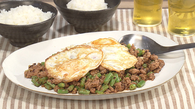 目玉焼きをくずして全体を混ぜ、白いごはんと一緒に召し上がれ!