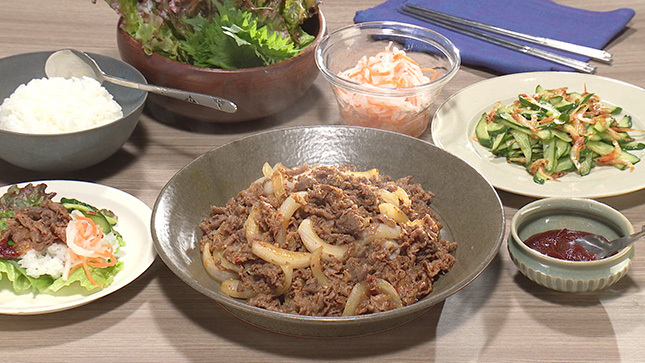 プルコギと歯ごたえが異なる甘酢あえや炒めものを一緒に、葉野菜で巻いて食べるのがおすすめ!