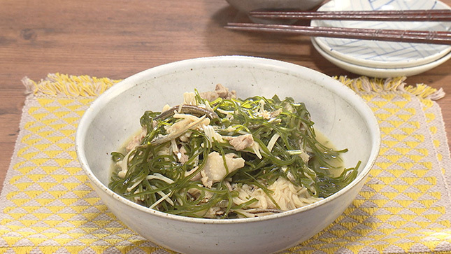 細く切った昆布を乾燥させたもので、今回はもどして売られているものを使用。サラダやあえもの、炒め煮などに使い勝手がよい。乾燥したものは水でもどして用いる。