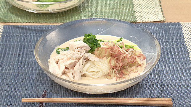 ゆでた鶏ささ身、豆苗、みょうがをのせることで、栄養バランスがよく、ボリュームのある一品になります