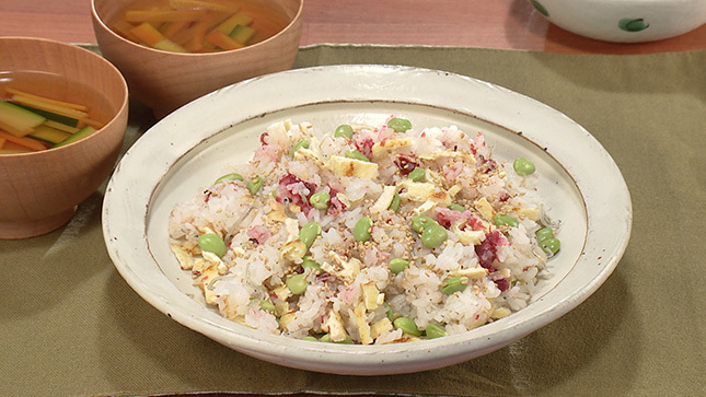 具だくさんで色々な味が楽しめる混ぜごはん。いろどりも鮮やかなので、食卓が華やかになります