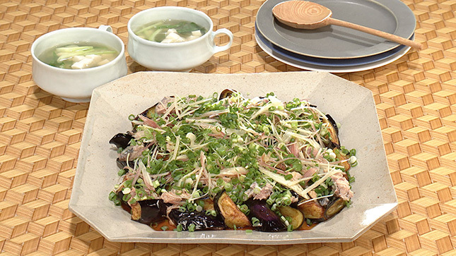 さば缶と揚げなすの薬味ポン酢がけ
