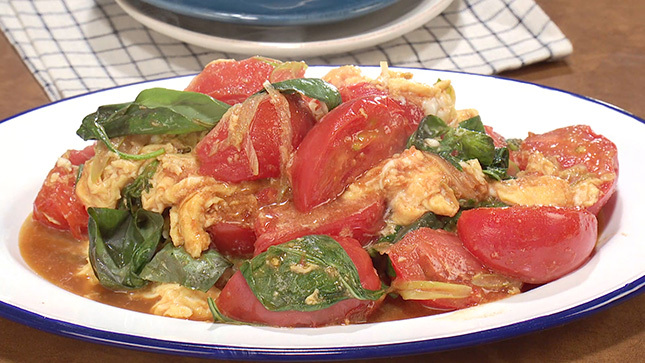 トマトに少し焼き色がついて、角が崩れてきたら、卵を戻し入れるタイミング!