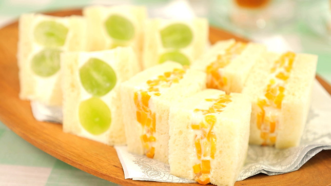 食パンにヨーグルトクリームをぬり、ごく小さいみかん2個を皮をむいて丸ごと横向きにして斜めに並べる。同様にしてはさみ、ラップで包んだら、切る位置の角に印をつけておく。みかんの上で斜め半分に切る。