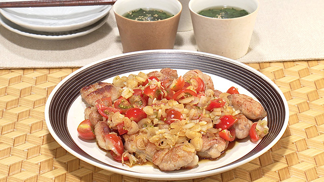 ミニトマト、らっきょう、すだちを合わせたたれは、残暑の厳しいこの時季にぴったり!