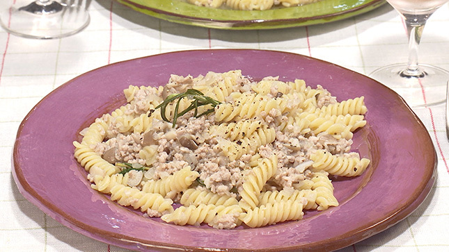 ラグービアンコはトマトを使わない白いミートソース。ローズマリーの香りがおいしさの決め手です!