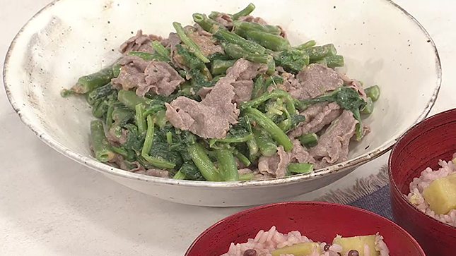 ごまだれあえの牛肉は、塩を加えてゆでると軽く下味がつき、水っぽくなりません