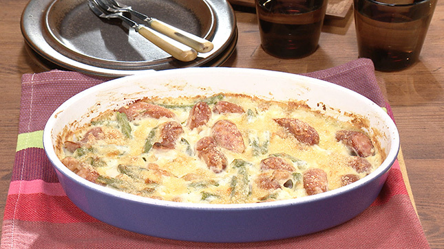 耐熱の器の中で具材に小麦粉をまぶすことで、ホワイトソースを作る手間が省け、洗い物も少なくなります