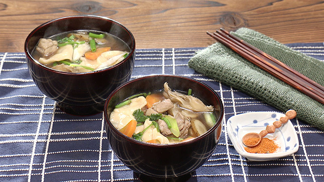 野菜もたっぷり食べられて、ほっとするおいしさの汁もの。お好みで七味唐辛子をふって、召し上がれ!