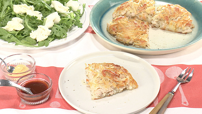 じゃが芋に鶏胸肉の細切りを加えることで、おかずになる、ボリュームのあるガレットになります
