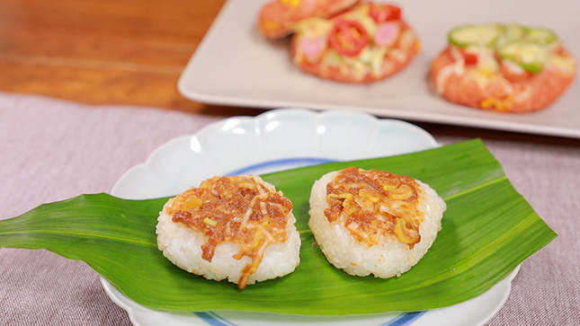 作り方(2)、(3)と同様にしてケチャップ味の焼きおにぎりを余分に作り、「ピザ風焼きおにぎり」にのせてライスバーガー風に食べてもよい。