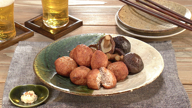 一緒に揚げるのは、椎茸以外にエリンギでもおいしいです。揚げたての熱いうちに塩をふってください
