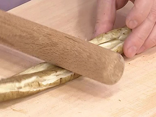 ごぼうはめん棒でたたいて軽く割ると、やわらかく、味がしみ込みやすくなります