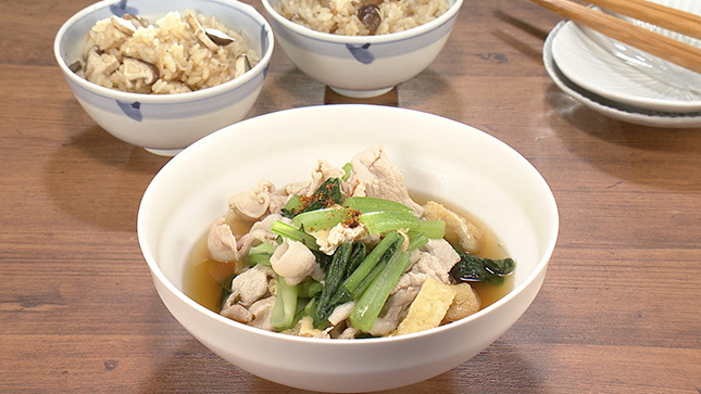 豚しゃぶ、小松菜、油揚げの煮びたし
