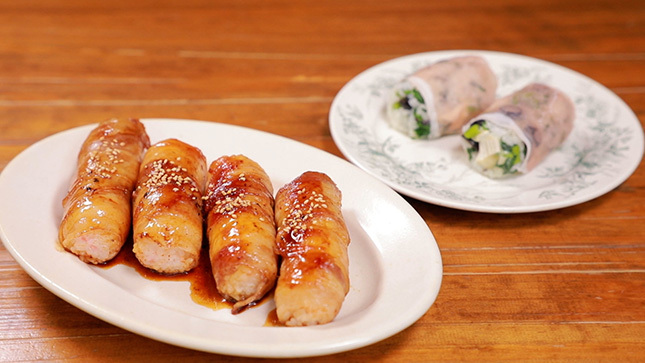肉は焼くと縮むので、ごはんに豚肉を巻くときは、ゆるめに巻くのがポイントです